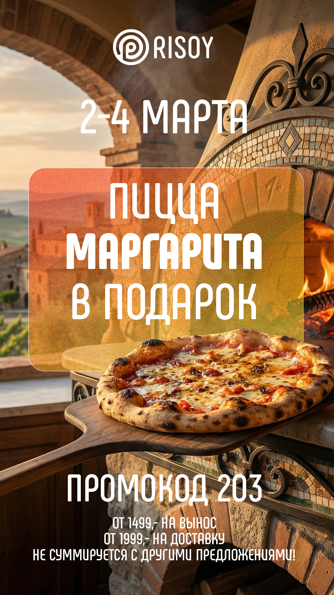 С 2 по 4 марта по промокоду 203 мы дарим* пиццу «Маргарита» к заказу!